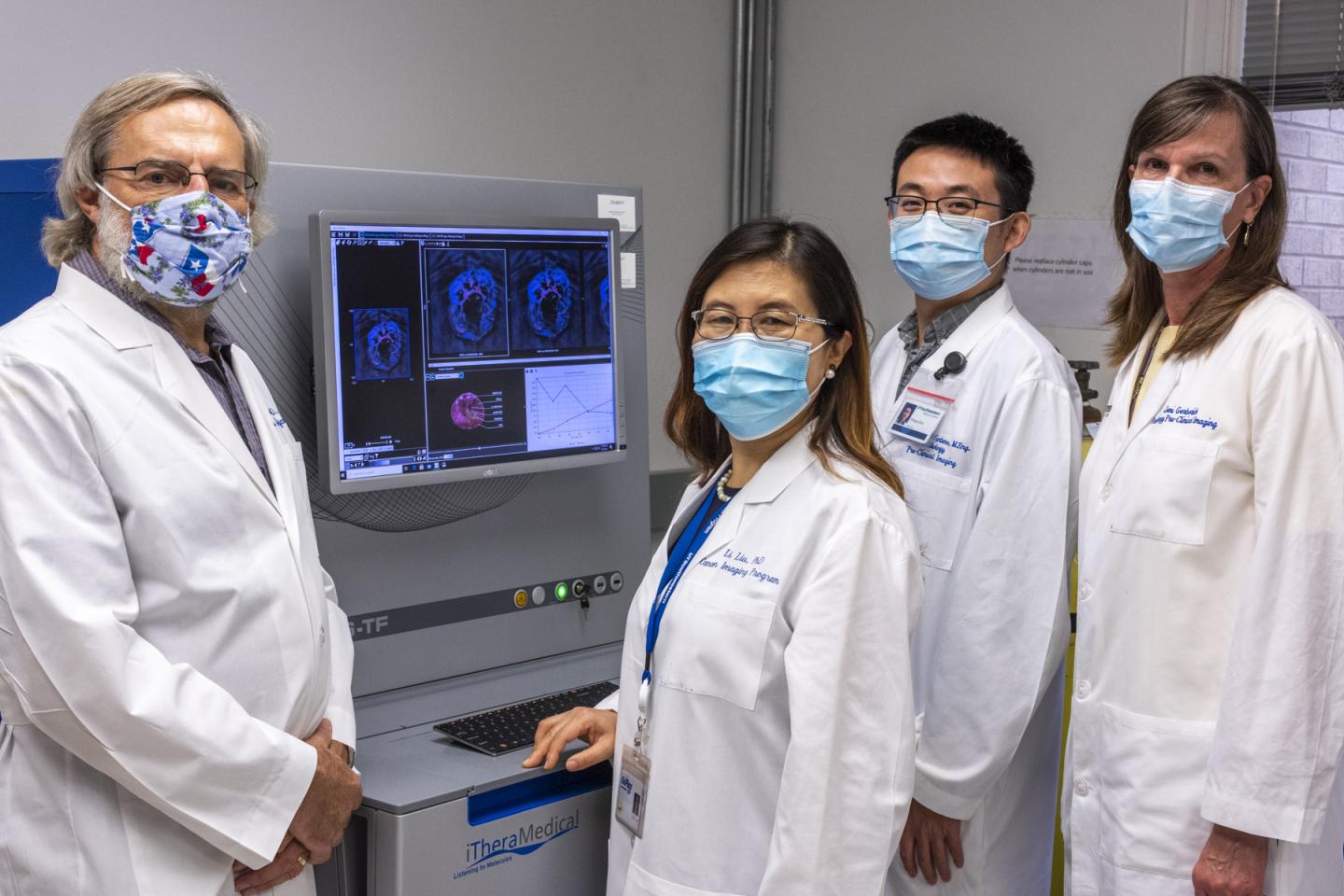 image: From left: Drs. Ralph Mason, Li Liu, and Yihang Guo, and researcher Jeni Gerberich used a new tool called multispectral optoacoustic tomography to examine non-small cell lung cancer tumors growing in mice. The study showed two experimental drugs can normalize the tumor microenvironment, helping to suppress a tumor's growth and spread.