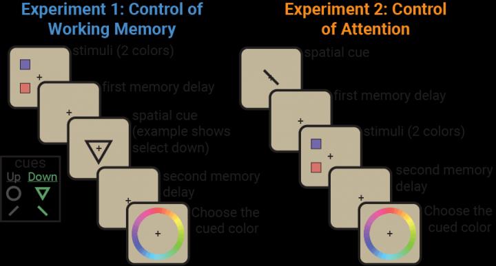 image: Princeton neuroscientists Timothy Buschman and Matthew Panichello have discovered that attention and working memory are much more closely connected than most modern cognitive scientists realized. They performed two experiments in which monkeys were shown two color blocks and a symbol that directed them to look at the top one (a circle or an upward slanted line) or the bottom one (a triangle or a downward slanted line). They then matched the selected color to its spot on the color wheel. In the first experiment (left), they saw the blocks first and then the directional signal. In the second (right), they saw the directional signal first and then the color blocks.