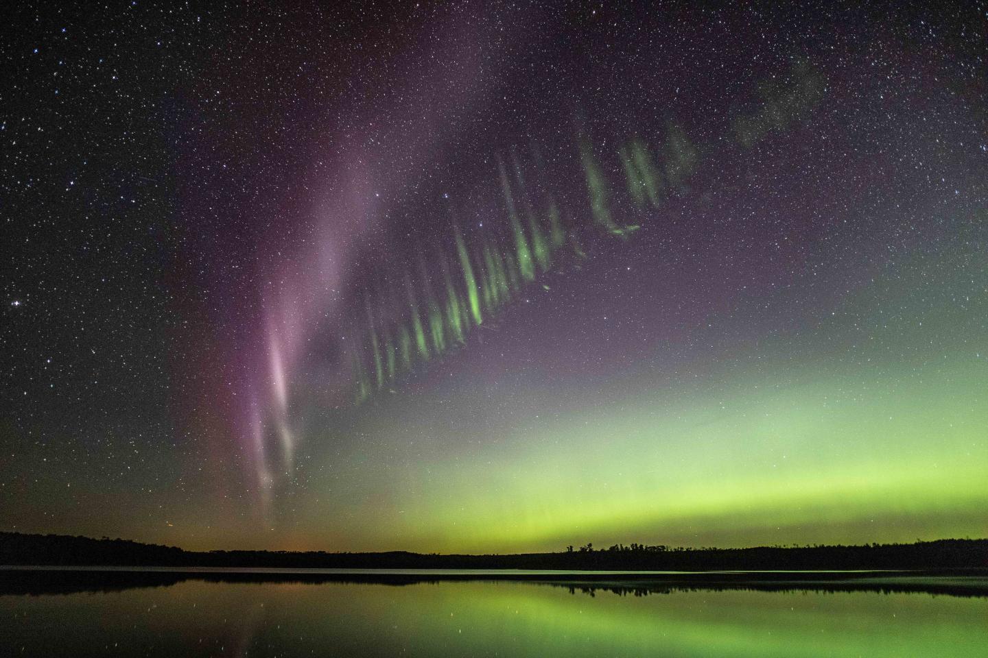 image: Taken July 17, 2018, at Little Kenosee Lake, Saskatchewan, Canada, this photo shows the tiny green streaks below STEVE. Neil Zeller, photographer and co-author on the paper, commented "STEVE was bright and powerful for a full hour that night."