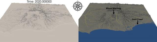video:Â Animation shows rock weathering (blue) and deposition (red) alongside changes to the Tweed Valley coast in eastern Australia in one of seven possible climate change scenarios.