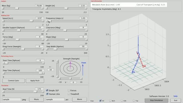 The avatar - a torso equipped with two legs with feet - can be freely configured. Users start by entering their height and weight and can then set the walking speed, distance between their feet (stride length and stride width), and foot lift, along with the incline of both the torso and the ground. They can also add mass and simulate the effect of being pushed or pulled at different parts of the body. The number of calories burned and the energy consumption are displayed in real time whenever the parameters are modified.