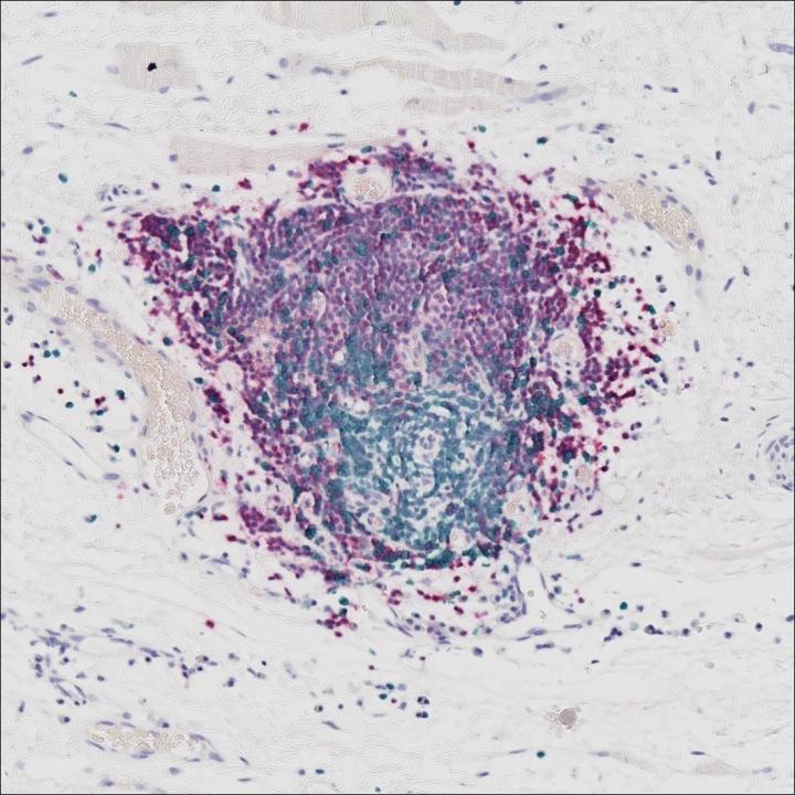 image: Tertiary lymphoid structures are cellular aggregates that contain many B-cells (in purple) located near tumors. This is the area where the antitumor immune response starts.
