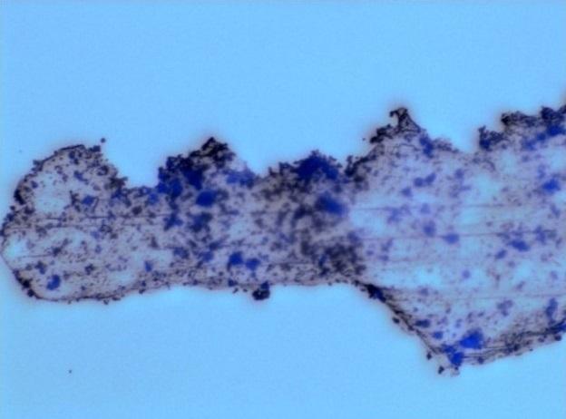 image: Metallic microrobots (dark blue dots) colonize a jagged piece of microplastic under visible light, breaking down the plastic into smaller molecules.