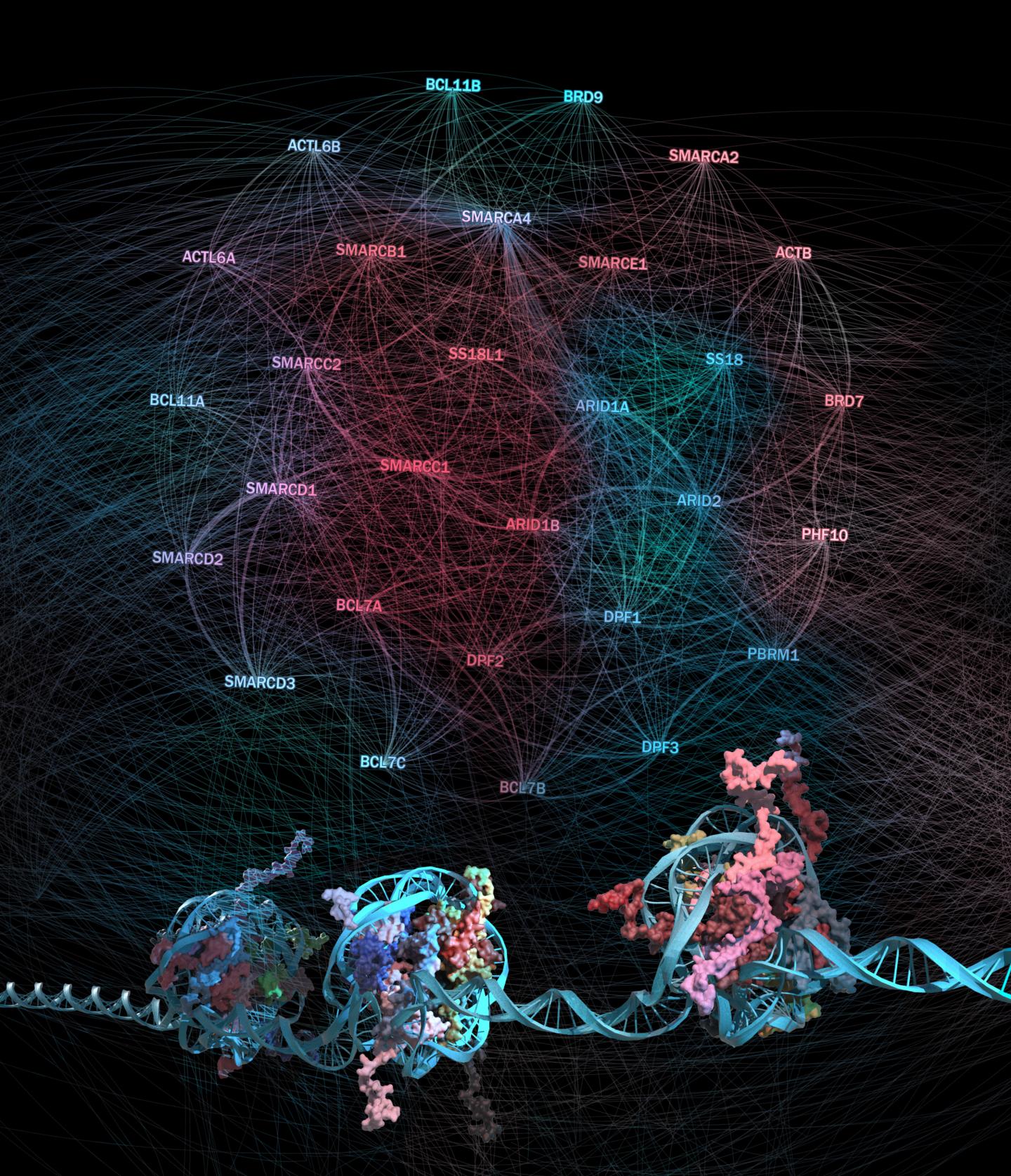 Chromatin organizes the approximately two meters of DNA present in the nucleus of every human cell so that, dependent on the cell type and state, certain genes can be activated, others repressed. The fundamental organizing unit of chromatin is the nucleosome, consisting of 146 base pairs of DNA wrapped around a histone octamer. Whenever a cell needs to adapt - for example, to respond to developmental or environmental signals or to DNA damage -, it needs to alter the accessibility of its DNA. Doing exactly this is the function of chromatin remodelers, enzymes that use the energy of ATP to move or evict nucleosomes. Chromatin remodeling complexes come in multiple flavors in human cells; a particularly interesting complex is the BAF complex. In fact, it is not only one complex, but many different ones. Up to 15 complex positions can be occupied by proteins encoded from 29 different genes, the combinatorics adding up to more than 10,000 theoretically possible different complexes.