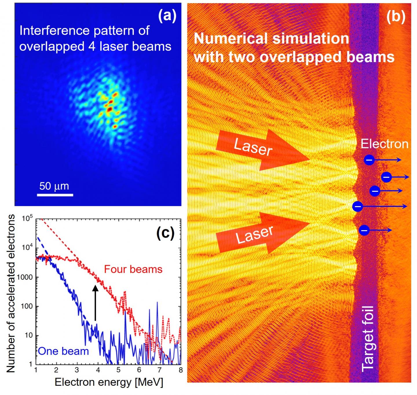 Osaka, Japan - A research team led by Osaka University showed how multiple overlapping laser beams are better at accelerating electrons to incredibly fast speeds, as compared with a single laser. This method can lead to more powerful and efficient X-ray and ion generation for laboratory astrophysics, cancer therapy research, as well as a path toward controlled nuclear fusion.