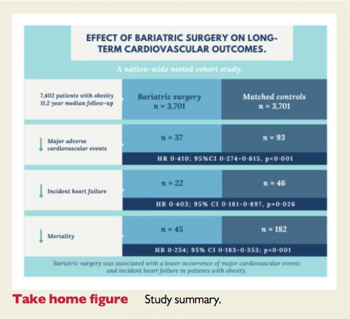 Dr Maddalena Ardissino, academic foundation trainee at Imperial and joint first author of the EHJ paper, said: "The results of our study indicated that the rates of heart attacks and strokes were significantly lower in those who underwent bariatric surgery; specifically, we observed lower rates of heart attacks. This means that bariatric surgery was associated with a 1.5% reduction in the absolute risk of heart attacks or strokes; 62 patients would need to have bariatric surgery to prevent one heart attack or stroke. As this was a young group of patients, in whom we would expect to see fewer such events than in older patients, the reduction in the absolute risk has important clinical implications.