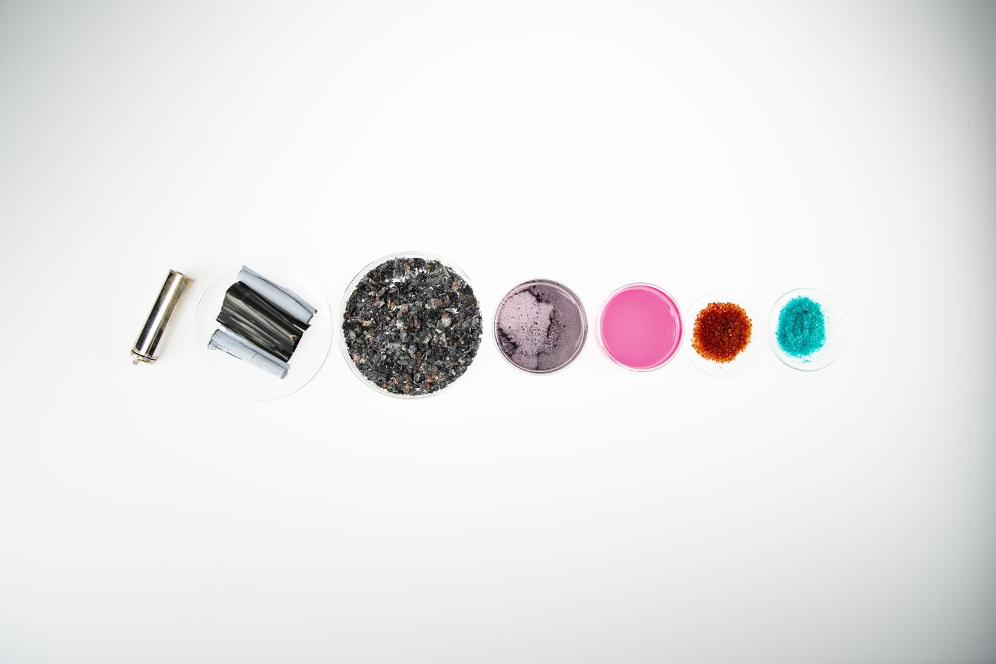 image: With new solution-based recycling processes, more raw materials can be recovered from batteries. In the picture, a red cobalt salt and a blue-green nickel salt have been obtained from a battery cell.
