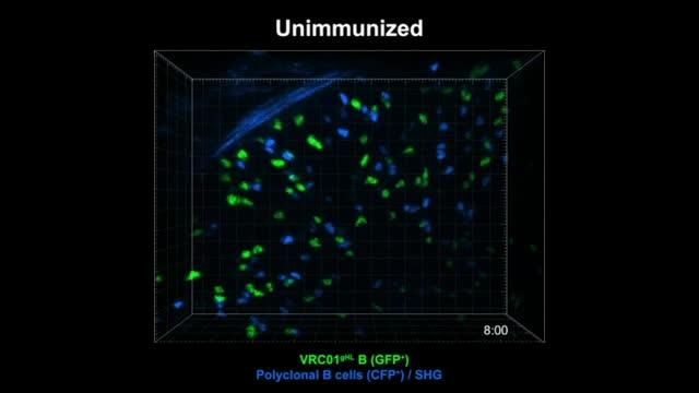 video: The researchers used a technique called two-photon microscopy to study how higher affinity B cells (green), non-specific B cells (blue) and T cells (pink) interacted in living mice.