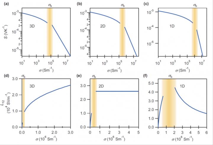 image: (a)-(c) show how the Seebeck coefficient varies for 1D, 2D and 3D materials, while (d)-(f) show the thermoelectric conductivity for the same systems. No major changes in the shape of the curves are seen for (a)-(c); drastic changes are seen for (d)-(e) beyond a threshold range marked in yellow, making thermoelectric conductivity a much more sensitive, unambiguous measure for dimensionality.