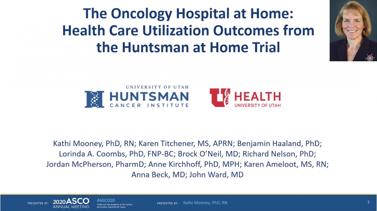 SALT LAKE CITY - Researchers at Huntsman Cancer Institute (HCI) at the University of Utah (U of U) presented the first outcomes evaluation of an adult oncology hospital-at-home program today at the 2020 American Society of Clinical Oncology (ASCO) annual meeting. The study evaluated patients participating in HCI's Huntsman at HomeTM. The data demonstrate strong evidence for this care model, showing improved patient outcomes, including reduced hospitalizations and decreased visits to the emergency department.