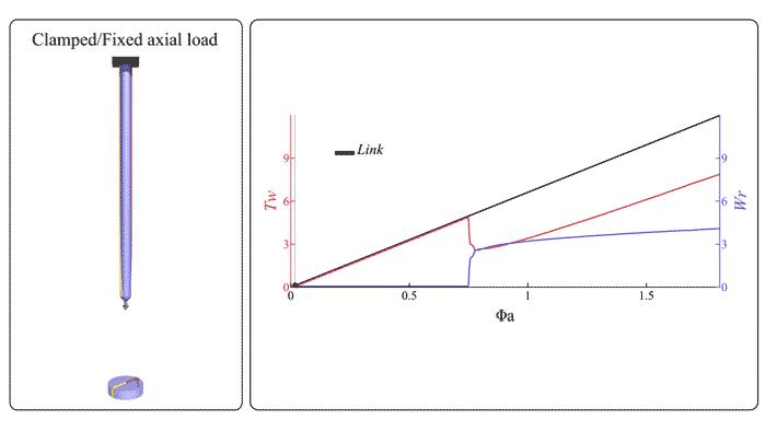 image: A filament is clamped at the top end and prestretched by a small amount by applying a downward axial load to the bottom end. The bottom end is then twisted, keeping the axial load on the bottom end constant. After a critical amount of twist is inserted, the filament spontaneously buckles into a loopy.