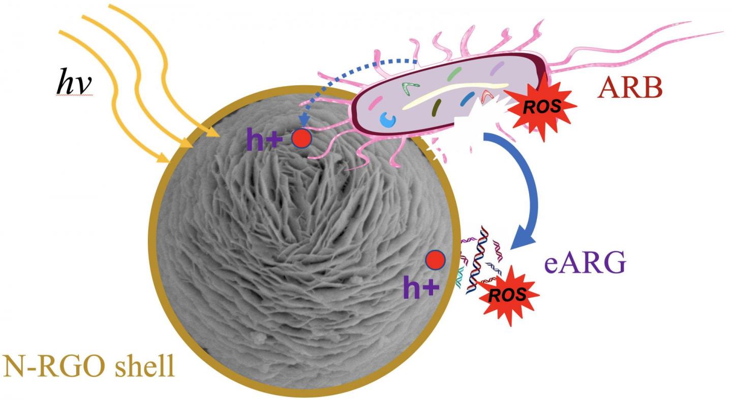 image: Improved bacterial affinity and reactive oxygen species generation enhances antibacterial inactivation in wastewater by graphene oxide-wrapped nanospheres developed by scientists at Rice University and Tongji University, Shanghai. Antibiotic resistance genes (eARG) released by inactivated antibiotic resistant bacteria (ARB) in the vicinity of photocatalytic sites on the spheres facilitates their degradation.