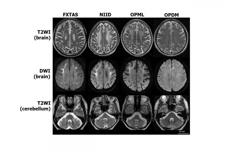 image: Four rare diseases are characterized by similar symptoms of neurodegeneration. Patients with three of the diseases -- fragile X tremor/ataxia syndrome (FXTAS), neuronal intranuclear inclusion disease (NIID) and oculopharyngeal myopathy with leukoencephalopathy (OPML) -- have similar MRI brain scan images. Patients with a fourth disease, oculopharyngodistal myopathy (OPDM), have normal brain scans, but their muscle tissue has a similar appearance to that of patients with OPML. Researchers suspected that the genetic mutations causing the four diseases must also be similar, even if the mutations were in different genes. After exhaustive genetic sequencing and analysis, researchers in Japan discovered that the same mutation -- CGG noncoding expanded tandem repeats -- in different areas of the genome causes all four diseases.