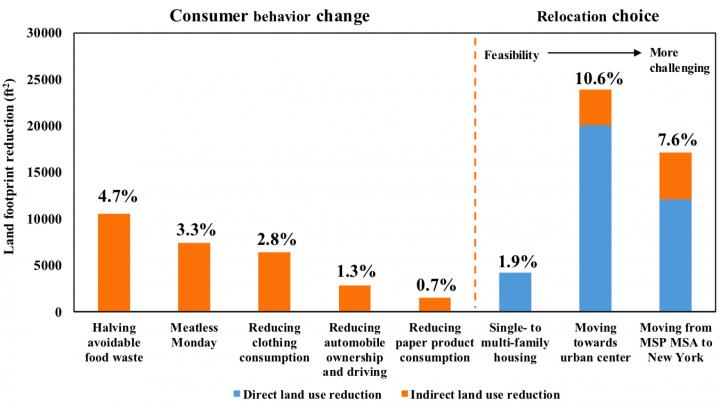 image: Princeton researchers developed a tool for examining consumption-based land footprints and found that when direct land-use such as housing is combined with indirect land-use through the consumption of goods and services, each of our imprints on the land could be significantly higher than most people are aware. They identified five individual actions (at left) that could reduce people's indirect land footprint (orange). The percentages indicate the decrease in an individual's indirect footprint by square-foot based on the action taken. The researchers also evaluated how a person's direct land-use (blue) is affected by their housing decisions, including moving into a multi-family dwelling, living in the heart of the nearest city, and relocating from a median-density metro area such as Minneapolis-Saint Paul (MSP) to a more densely populated area such as New York City. Moving to a more urban area reduced a person's total footprint due to the greater availability of goods and services in a city.