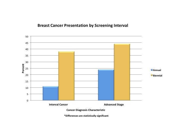 "Screening mammography performed once a year resulted in less advanced stage disease in patients diagnosed with breast cancer," Dr. Moorman said.