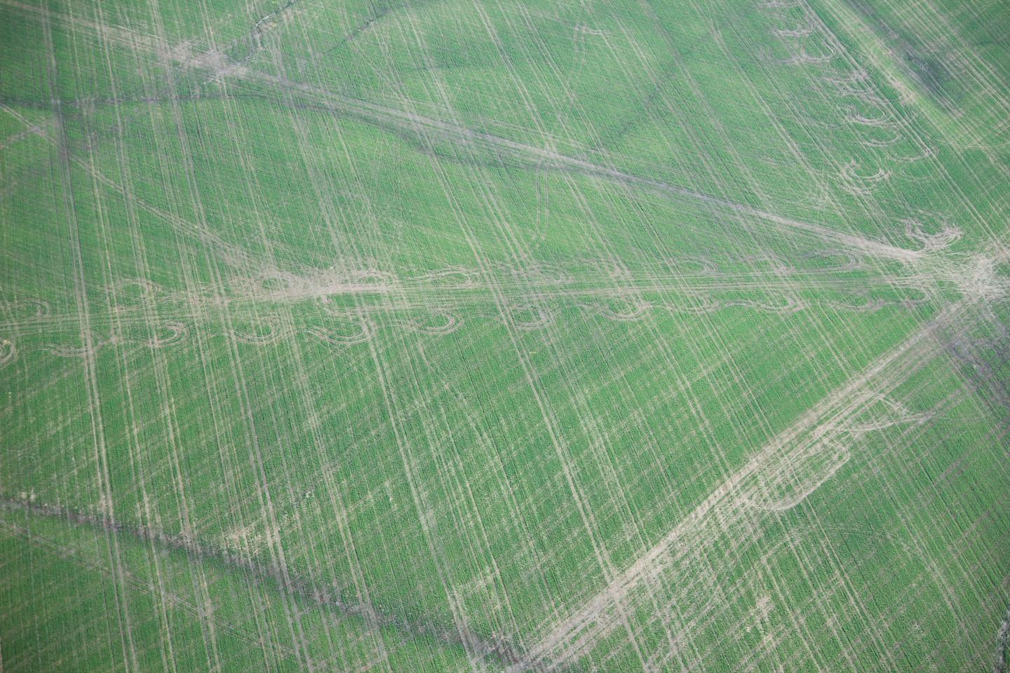 image: Aerial photo of wheel-traffic compaction on early-season crop stands in western Minnesota.