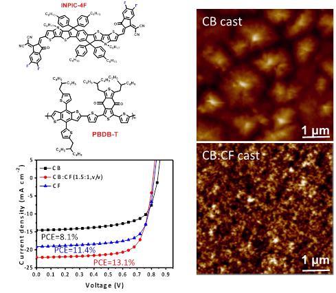 Very recently, Professor Tao Wang's group in Wuhan University of Technology demonstrated an effective approach to tune the molecular organization of a fluorinated NFA (INPIC-4F), and its phase separation with the donor PBDB-T, by varying the casting solvent (CB, CF and their mixtures). When a high boiling-point solvent CB was employed as the casting solvent, INPIC-4F formed lamellar crystals which further grow into micron-scale spherulites, resulting in a low PCE of 8.1% only. When the low boiling-point solvent CF was used, the crystallization of INPIC-4F has been suppressed and the low structure order leads to a moderate PCE of 11.4%. By using binary solvent mixture (CB:CF=1.5:1, v/v), the efficiency of PBDB-T:INPIC-4F non-fullerene OSCs was improved to 13.1%. These results show great promise of binary solvent strategy to control the molecular order and nanoscale morphology for high efficiency non-fullerene solar cells.