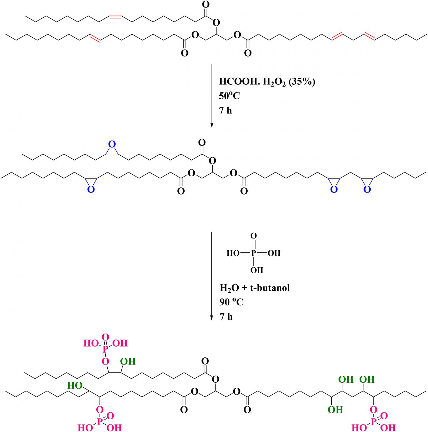 image: Synthesis of epoxidized sunflower oil (ESFO) and phosphorylated polyol (Phospol)