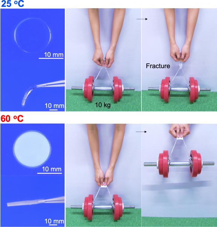 image: The gel is soft and transparent at 25°C and cannot support a 10 kg weight (top panels) but it quickly becomes rigid and opaque when heated to 60°C, becoming strong enough to support the weight (bottom panels). (Nonoyama T. et al., Advanced Materials, November 18, 2019)