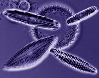 Streams contain a variety of types of algae that remove pollutants from the water. This microscope image shows several species of algae similar to those used in the University of Michigan biodiversity study.