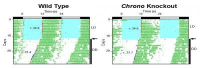 Given these results, the team renamed Gene Model 129, CHRONO, for computationally highlighted repressor of the network oscillator. The litmus test for identifying clock genes, however, is whether they regulate behavior: In mice in which CHRONO had been knocked out, Hogenesch found that the mice had a prolonged circadian period.
