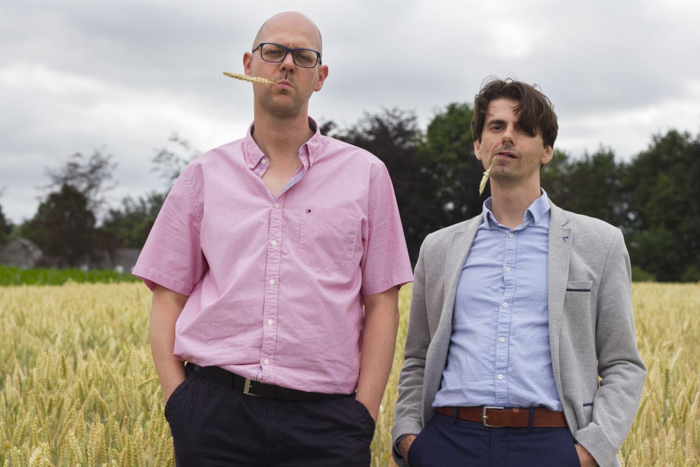 image: This image shows authors Ive De Smet and David Vergauwen in a field of wheat, one species that has been the focus of this type of research.