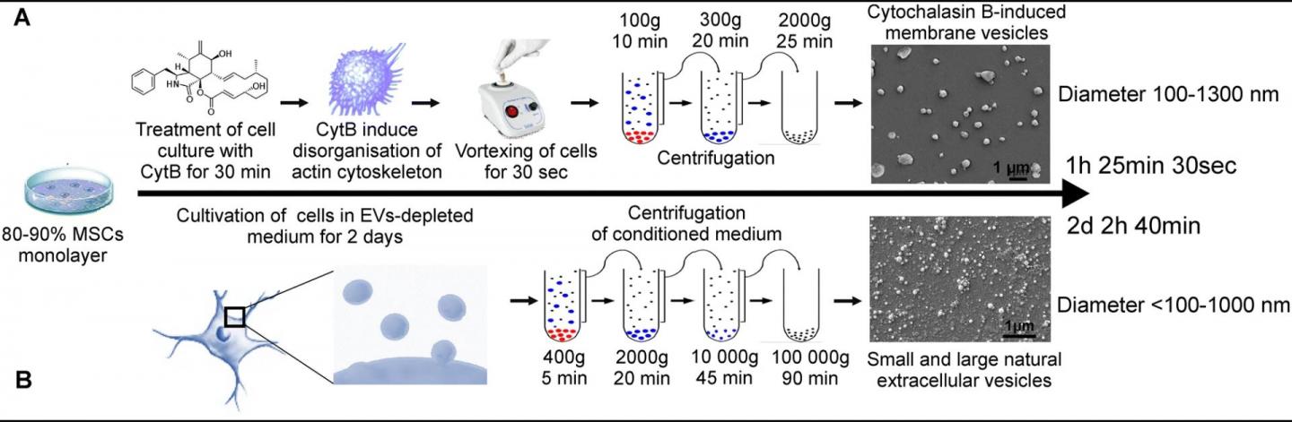 image: Production of cytochalasin B-induced microvesicles (A) and natural EVs (B). Schematic of isolation procedure, time required for isolation, representation of CIMVs and EVs size.