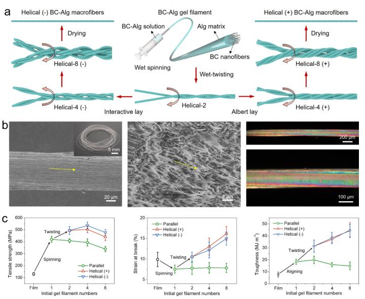 Inspired by these structural features in biosynthesized fibers, they presented a design strategy to make nanocellulose-based macrofibers with similar structural features. They used bacterial cellulose nanofibers as the strong and stiff building blocks, sodium alginate as the soft matrix. By combining a facile wet-spinning process with a subsequent multiple wet-twisting procedure, they successfully obtained biomimetic hierarchical helical nanocomposite macrofibers, and realized impressive improvement of their tensile strength, elongation and toughness simultaneously as expected.