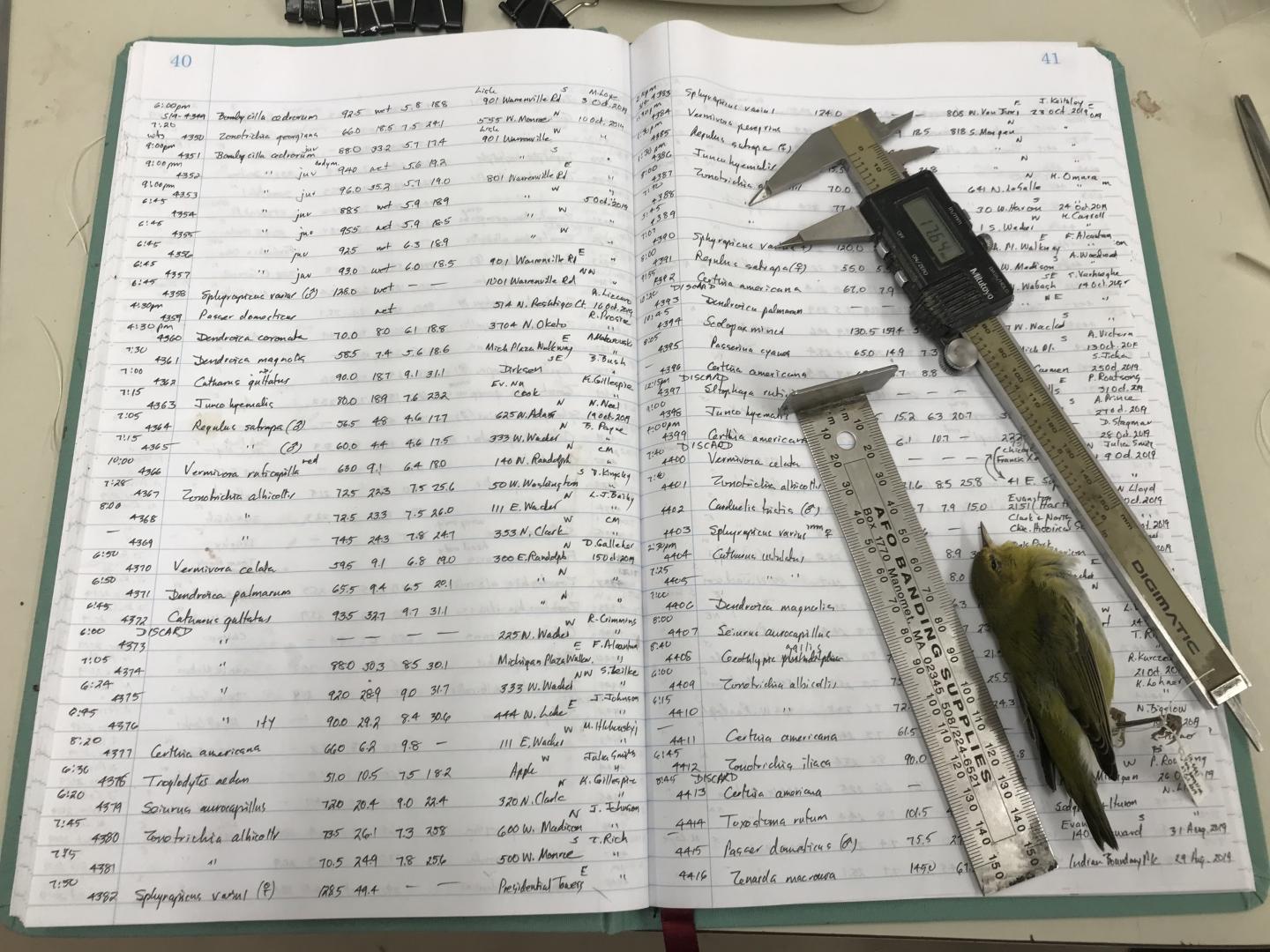 image: One scientist, Dave Willard, took the measurements of the 70,716 bird specimens in this study and recorded them by hand into ledgers like this. This photo shows one of Willard's ledgers, his measuring tools, and a Tennessee Warbler.