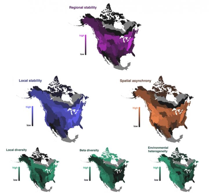 image: Geographic variation in bird biodiversity and stability over two decades. Figure by Catano et al from paper available at https://royalsocietypublishing.org/doi/10.1098/rspb.2019.2520