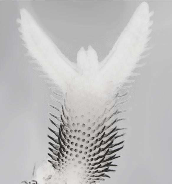 Sonic hedgehog is normally produced at the posterior margin of the embryonic chicken wing bud. Grafts of Sonic hedgehog-producing cells were made to the anterior side of a wing bud of another chicken embryo. This operation duplicates the tissues of the mature wing, including the black-pigmented feather buds as shown in the image. The flight feathers buds are the ones protruding from the left and right margins of the wing. Duplicated tissues are on the anterior side of the image (left), and normal tissues are on the posterior side (right).
