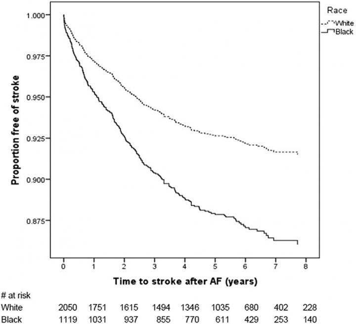 image: Multivariable-adjusted incidence curves of ischemic stroke in blacks and whites. The Kaplan-Meier curves represent the incidence of ischemic stroke after adjustment for age, sex, smoking, hypertension, diabetes, obesity, heart failure, coronary heart disease, chronic kidney disease, vascular disease, and aspirin and warfarin use. AF = atrial fibrillation.