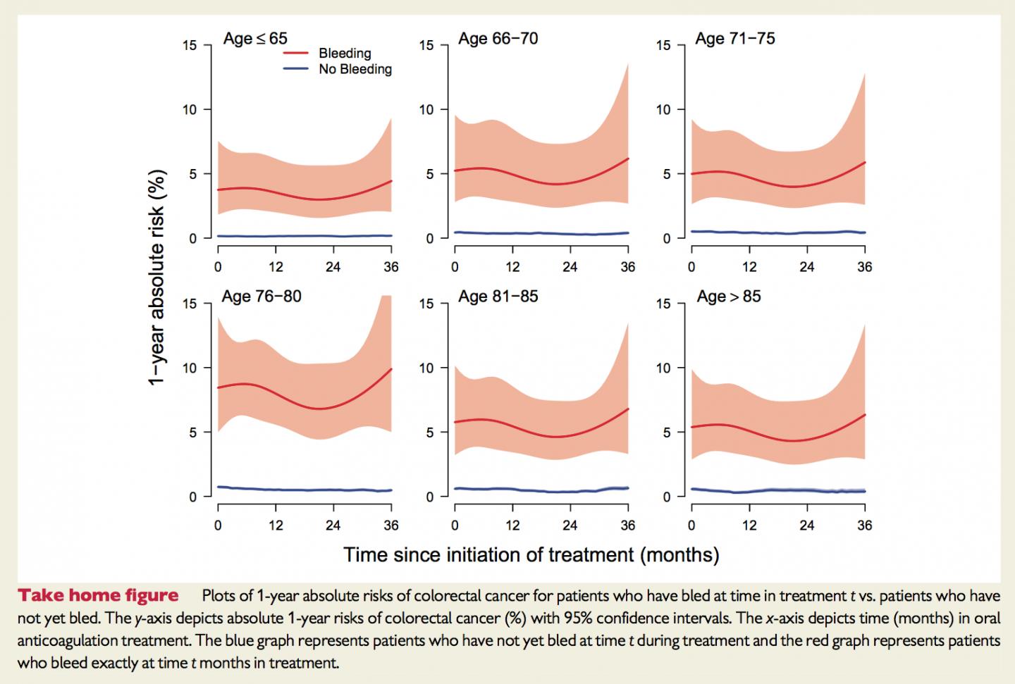 The risk of bowel cancer being diagnosed in the first year after bleeding depended on the patients' age. Patients aged 65 or younger with bleeding were 24 times more likely to have bowel cancer detected than those of the same age without bleeding, while older patients (aged 71 to 75 years) with bleeding were 11 times more likely to have bowel cancer than those without bleeding.