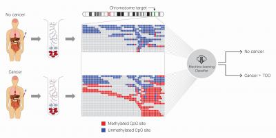 image: Identification of cancer status for more than 50 cancer types, as well as tissue of origin localisation, from a single blood draw. Cell-free DNA is isolated from blood samples drawn from a patient without cancer (top) or with cancer (bottom), and subjected to a targeted methylation sequencing assay. Sequencing results identifying methylated (red) or unmethylated (blue) CpG regions are fed into a machine-learning classifier that can identify the presence or absence of cancer, as well as identify the tissue of origin.