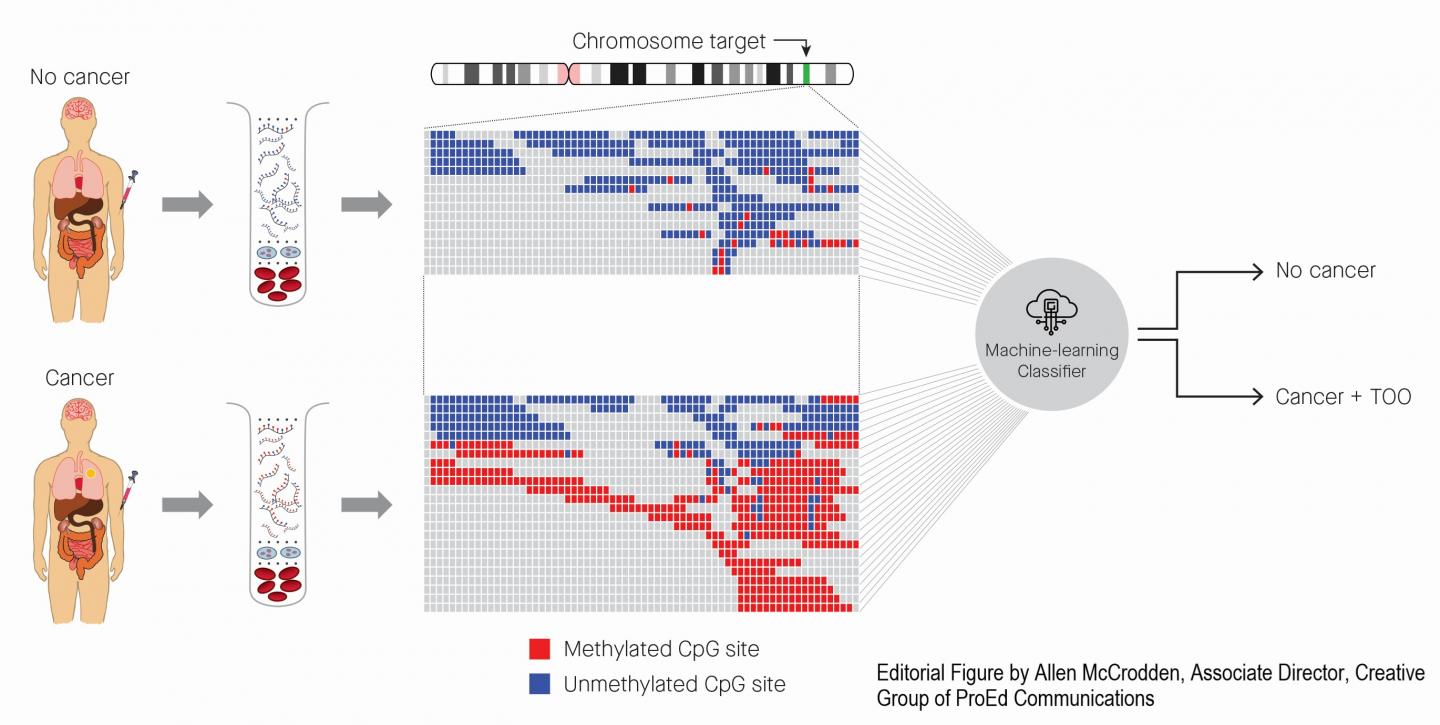 image: Cell-free DNA is isolated from blood samples drawn from a patient without cancer (top) or with cancer (bottom), and subjected to a targeted methylation sequencing assay. Sequencing results identifying methylated (red) or unmethylated (blue) CpG regions are fed into a machine-learning classifier that can identify the presence or absence of cancer, as well as identify the tissue of origin (TOO).