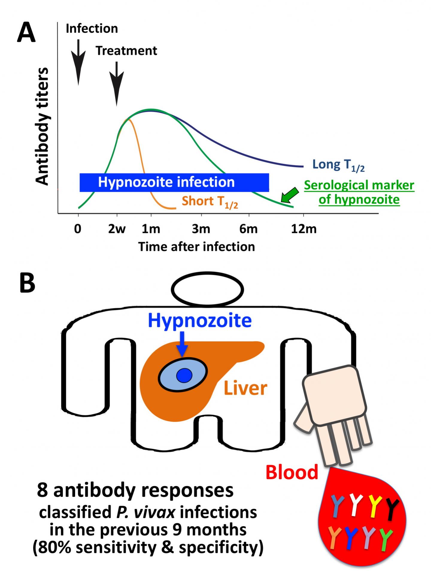 image: (A) How to detect dormant hypnozoite of P. vivax? Antibodies can predict recent infections if they have the correct kinetic profile (Green line, serological marker of hypnozoite). Antigens selected based on the kinetic profiles in 9 months following clearance of infection are candidates for detecting hypnozoites. (B) Hypnozoite biomarkers. Eight antibody responses classified P. vivax infections in the previous 9 months with 80% sensitivity & specificity.