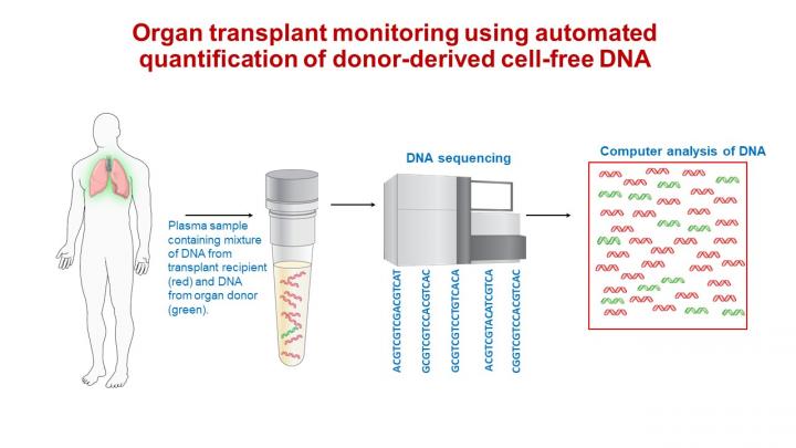 Called the donor-derived cell-free DNA test, the experimental test begins with obtaining a few blood droplets taken from the arm of the transplant recipient. A special set of machines then sorts the DNA fragments in the blood sample, and in combination with computer analysis, determines whether the fragments are from the recipient or the donor and how many of each type are present. Because injured or dying cells from the donor release lots of donor DNA fragments into the bloodstream compared to normal donor cells, higher amounts of donor DNA indicate a higher risk for transplant rejection in the recipient.