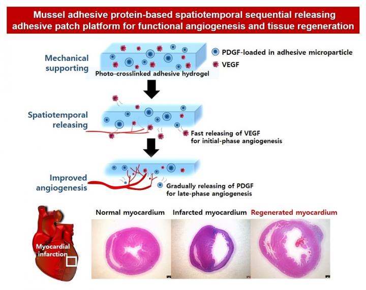 Blood vessels deliver nutrients and oxygen to each organ in our body. They are difficult to completely restore to their original conditions once damaged by myocardial infarction or severe ischemic diseases. This is because various angiogenic growth factors must be applied sequentially in order to restore the vascular structure. Recently, a research team at POSTECH has bioengineered a novel adhesive patch platform that can efficiently deliver blood vessel-forming growth factors spatiotemporally using mussel adhesive protein (MAP), a bio-adhesive material that is made from mussels harmless to humans.