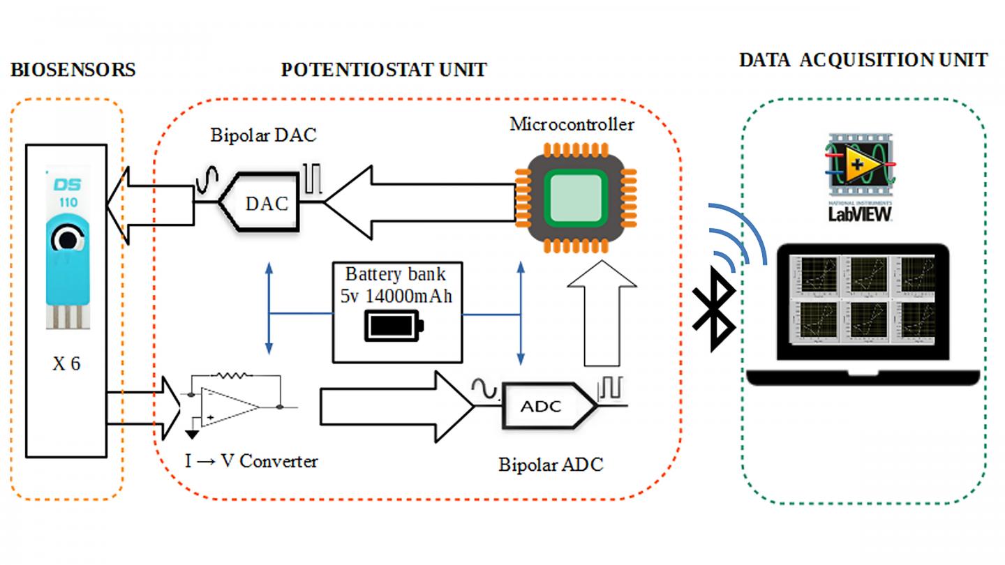 image: Block diagram of the multichannel potentiostat with six 3-electrode biosensors producing data that flows through a printed circuit board and transmits wirelessly to a LabVIEW interface using Bluetooth.