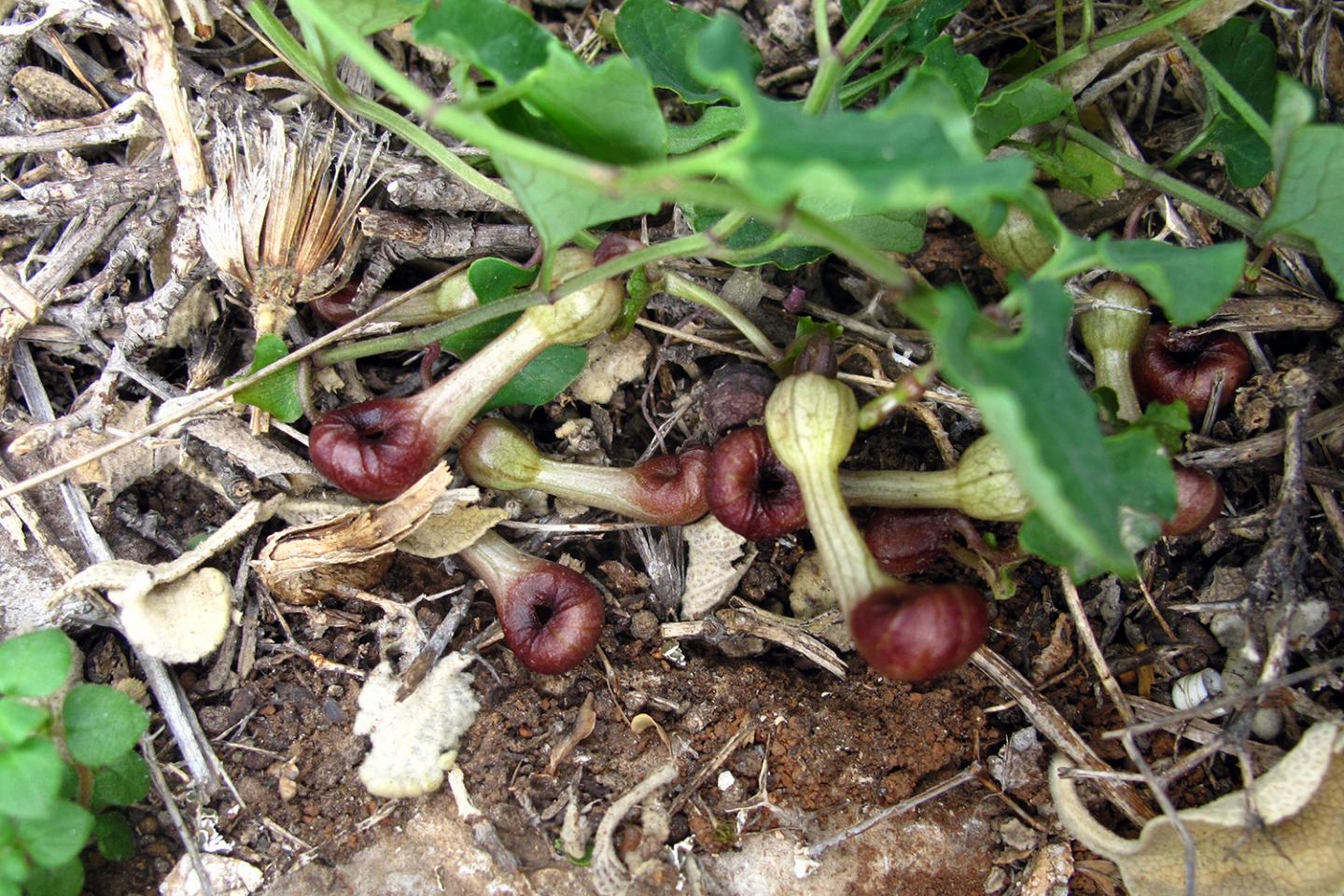 image: Unlike other Aristolochia species with their showy flowers, A. microstoma has inconspicuous brownish flowers that are horizontal, partially buried or close to the ground under leaf litter or stones. The flowers emit an unpleasant, carrion-like odor to attract and trap pollinators.