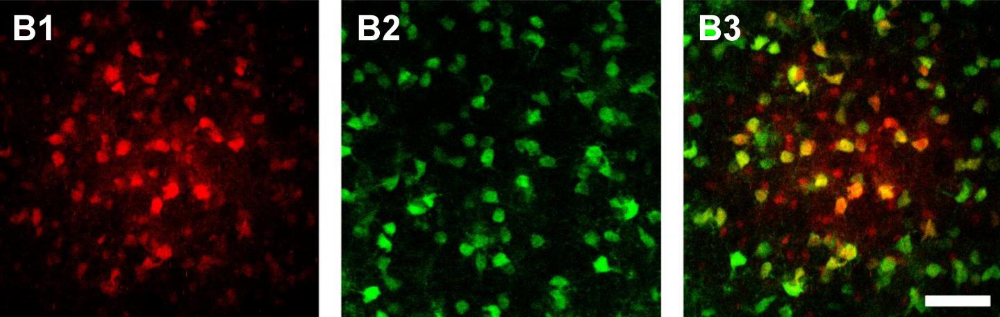 image: When an astrocyte in the thalamus is filled with a dye, it diffuses into neighboring cells of the network (red). These include many oligodendrocytes (green), as shown by the overlay (B3, yellow).