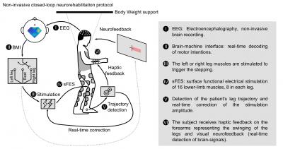 The two patients with paraplegia (AIS C) used their own brain activity to control the non-invasive delivery of electrical pulses to a total of 16 muscles (eight in each leg), allowing them to produce a more physiological walk than previously reported, requiring only a conventional walker and a body weight support system as assistive devices. Overall, the two patients were able to produce more than 4,500 steps using this new technology, which combines a non-invasive brain-machine interface, based on a 16-channel EEG, to control a multi-channel functional electrical stimulation system (FES), tailored to produce a much smoother gait pattern than the state of the art of this technique.