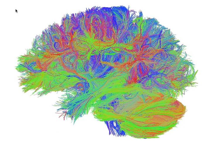 image: This is a whole brain reconstruction of the human structural connectome showing white matter connections between different brain regions.