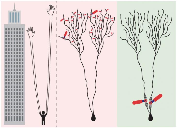 image: Image representing the old synaptic (red) and new dendritic (green) learning scenarios of the brain. In the center a neuron with two dendritic trees collects incoming signals via many thousands of tiny adjustable learning parameters, the synapses, represented by red valves. In the new dendritic learning scenario (right) only two adjustable red valves are located in close proximity to the computational element, the neuron. The scale is such that if a neuron collecting its incoming signals is represented by a person's faraway fingers, the length of its hands would be as tall as a skyscraper (left).
