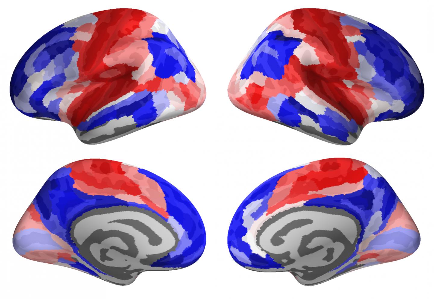 image: The red brain regions belong to the "conservative" pattern of adolescent development, while the blue brain regions belong to the "disruptive" pattern