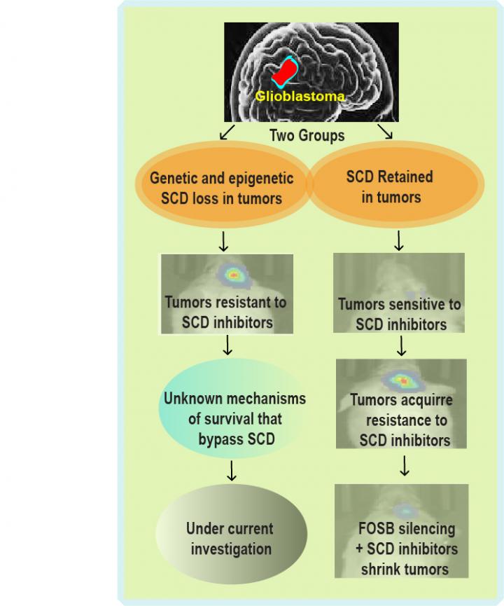 They also found that like most cancer cells, SCD inhibitor-sensitive glioblastomas ultimately acquire resistance to SCD inhibitors. They discovered that FOSB protein plays a central role in regulating SCD levels. When a drug knocks down SCD, FOSB kicks in to rapidly build SCD levels back up. This reinforcing effect overwhelms the anti-SCD medication effects and allows tumors to come roaring back.