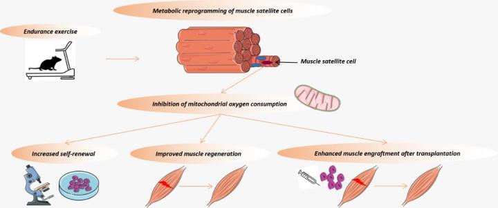 In addition to concluding that exercise maintained muscle tissue regeneration capacity and contributed to recovery from injury, the researchers measured satellite cell oxygen consumption in search of an explanation for the phenomenon. "Surprisingly we found them to consume less oxygen, as if they had become more economical," Abreu said.