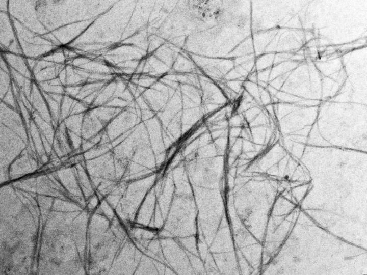 image: Alpha-synuclein fibrils. Shown here in an electron microscope image are fibrils produced in the laboratory for research purposes. The diameter of the fibrils is about 10 nanometres - 5000 times less than that of a human hair.