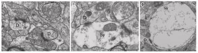 This image shows synaptic degeneration and impaired functional connectivity in cortex of Bmal1 knockout. Electron micrographs show presynaptic terminals (Sy) in 6-month-old wild-type mouse (A) and Bmal1 knockout (B and C) retrosplenial cortex. In Bmal1 knockout cortex, synaptic terminals are swollen and relatively devoid of synaptic vesicles, while the presynaptic and postsynaptic membranes, synaptic cleft, and dendritic spine [D] have normal morphology. Bmal1 knockout mice showed both normal and abnormal terminals. Activated astrocytes and numerous organelle-rich astrocytic processes were seen throughout the Bmal1 KO cortical tissue. Scale bars: 500 nm.