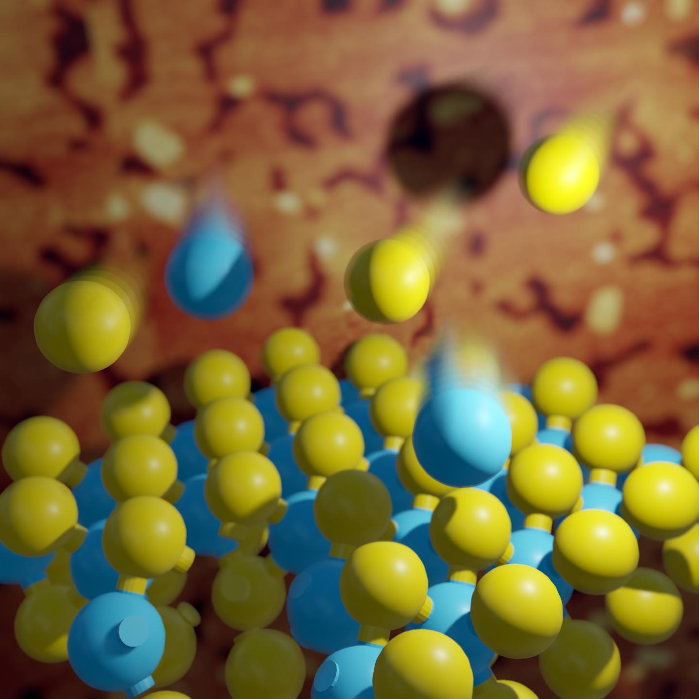 image: Artistic visualisation: monolayer of 2D material -- molybdenum diselenide (MoSe2) is grown by directing molecular beams of selenium (yellow) and molybdenum (blue) on atomically flat hexagonal boron nitride substrate. Thanks to this substrate, MoSe2 epilayer exhibits excellent optical properties. The image was chosen for the cover of the May 2020 issue of ACS Nano Letters (Source: UW Physics, A. Bogucki, W. Pacuski)